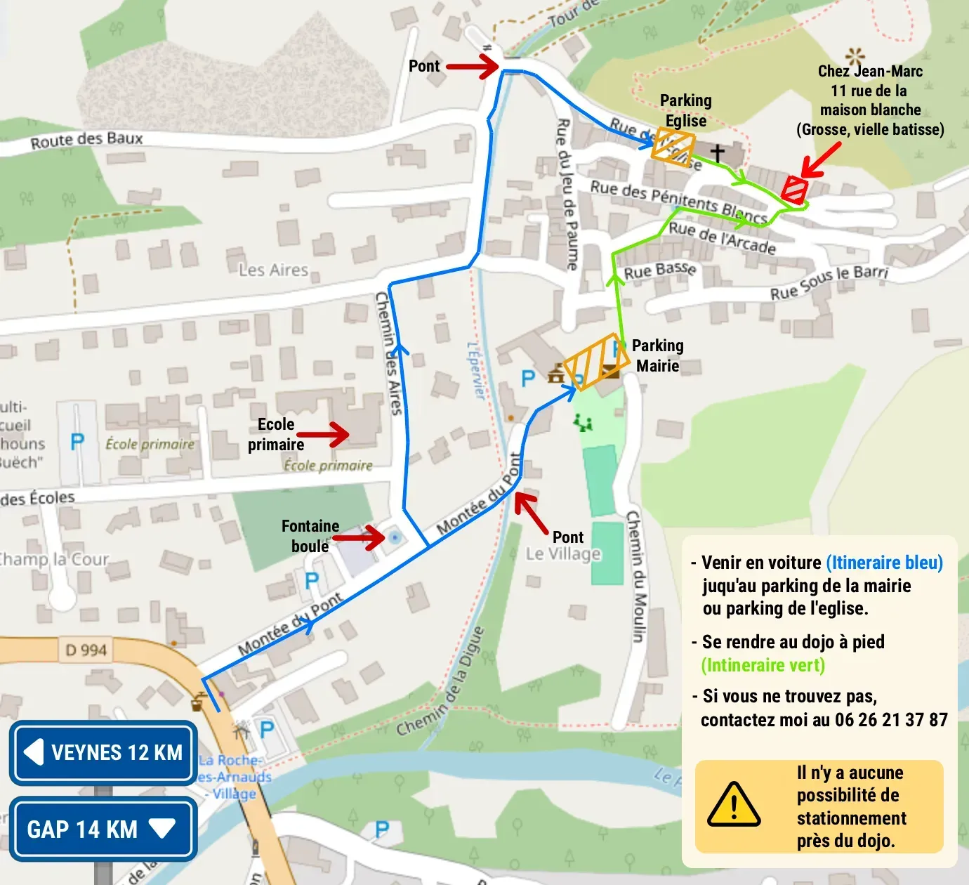 Le dojo se trouve au 11 rue de la maison blanche, dans le coeur du vieux village à La Roche des Arnauds, et donc les seules possibilités de parking sont